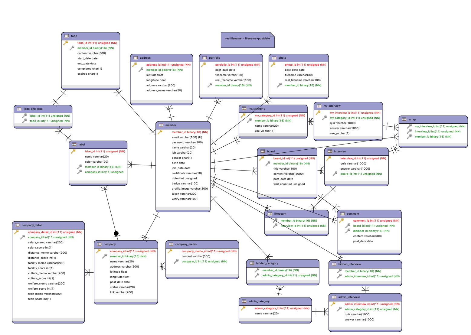 다만 정확히 어떤 식으로 줘야하는지 모르겠기에 일단 이번 프로젝트에서는 가능한선에서 사용해보기로 했는데, member_id 값에는 UUID를 넣어서 식별을 하고 나머지 테이블들의 PK는 Auto increment로 int(11) 데이터 타입으로 주었다.