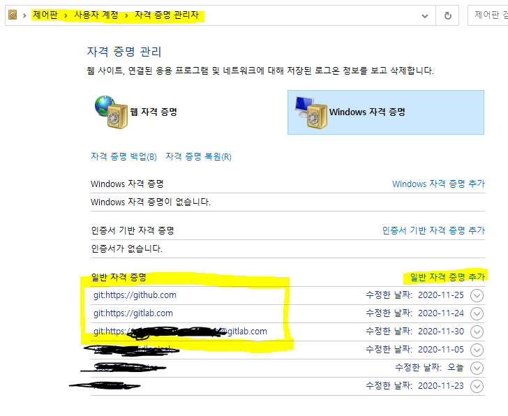 제어판 > 사용자계정 > 자격증명관리자로 들어가 갱신하자.