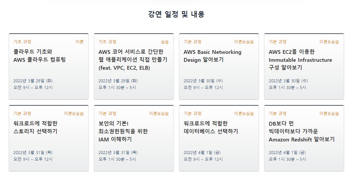 항상 내 카톡의 상단광고는 채용공고/개발자 교육 광고만 뜬다.(이제 알고리즘이 완전히 정착해버린듯 하다... 다른 내용이 뜨질않는걸 보니...) 이번에는 AWS 관련한 교육광고가 떠서 잽싸게 들어왔는데, 역시 AWS.. 저번에도 그렇고 또 여러가지가 몰아서 3월말에 한번에 몰아닥친다..!