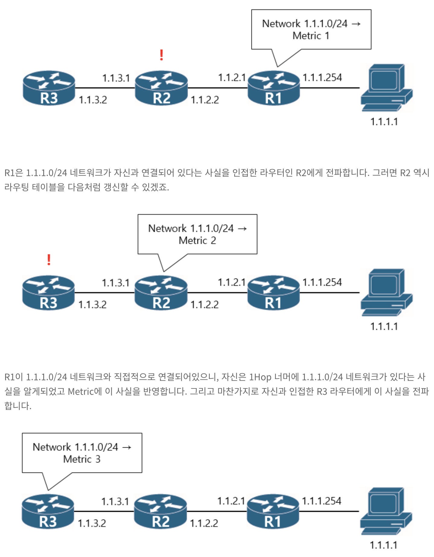 - RIP : 목적지까지 거치는 라우터(홉)의 수 - Hop count