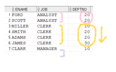 SELECT ename,job,deptno FROM emp ORDER BY job,deptno 일때는? (두개의 정렬조건을 주었을때)