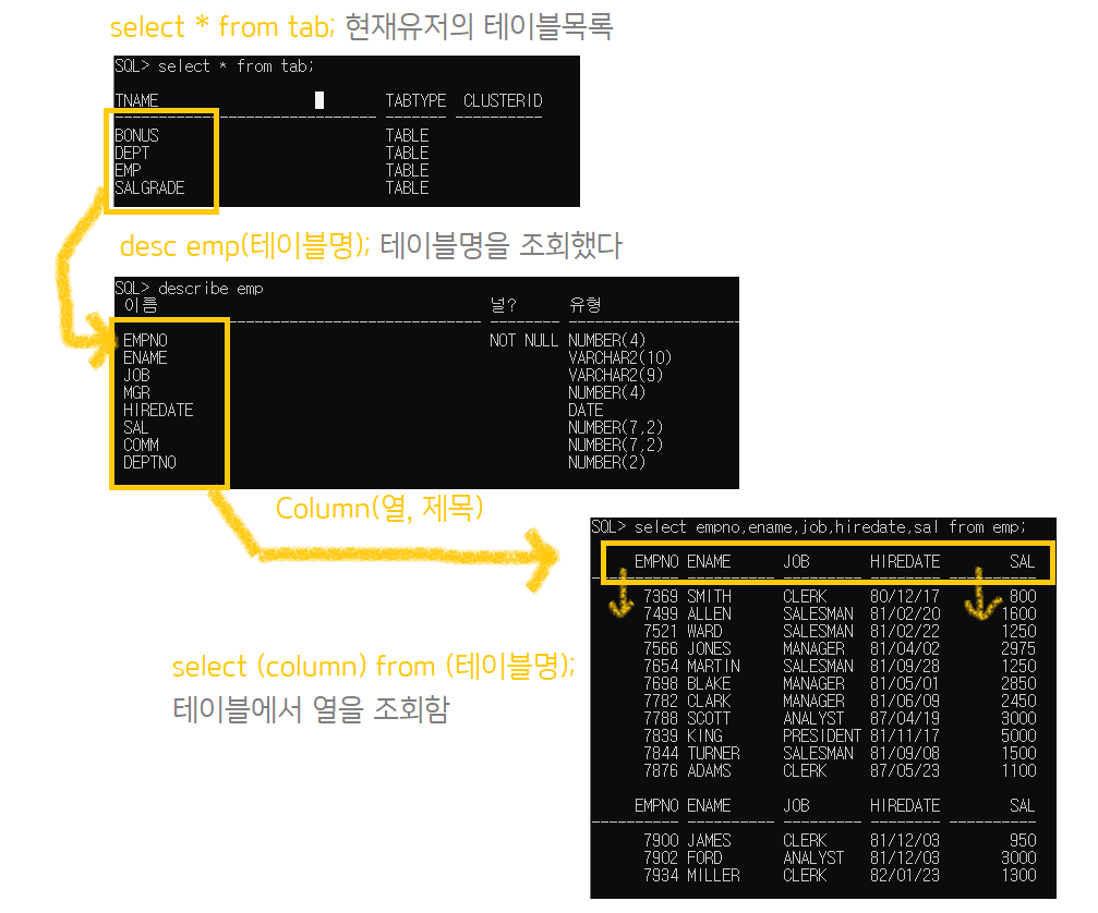 ex) SELECT '이름은' || ename || '입니다' FROM emp; - column AS 별칭 // "별' 칭" : Column을 검색하기 쉽게 별칭부여. 공백이나 ' 을 주고싶을때는 " "로 감싼다.